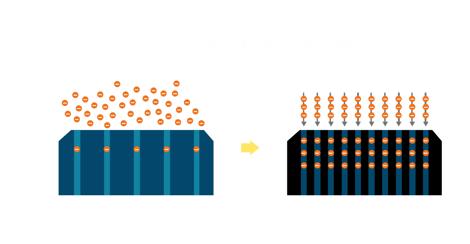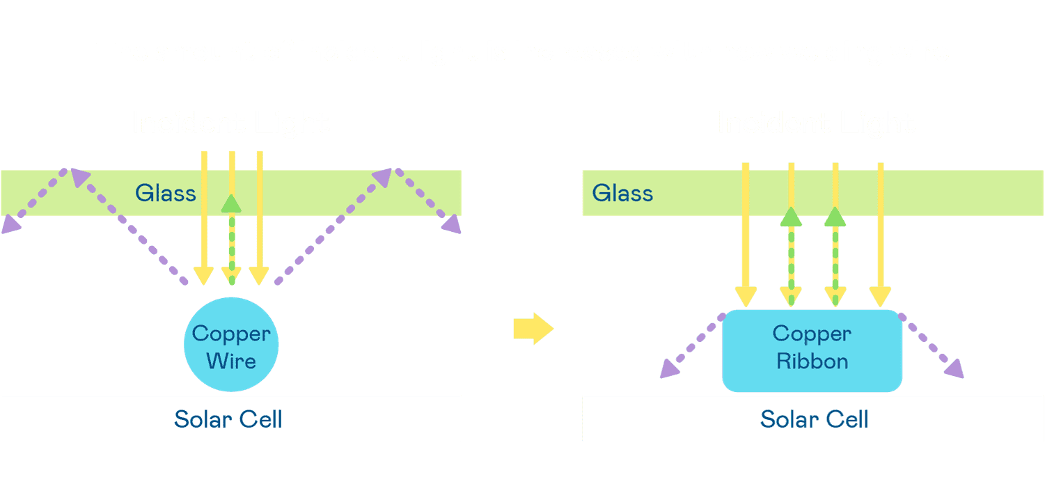 - 电池使用多条铜导线 (Copper wire) 于电池片上形成较短的电流路径,,,提高电流收集效率,,采用圆形设计的铜导线较传统扁平式的铜焊带 (Ribbon),,可增加入射至电池的光线量。。