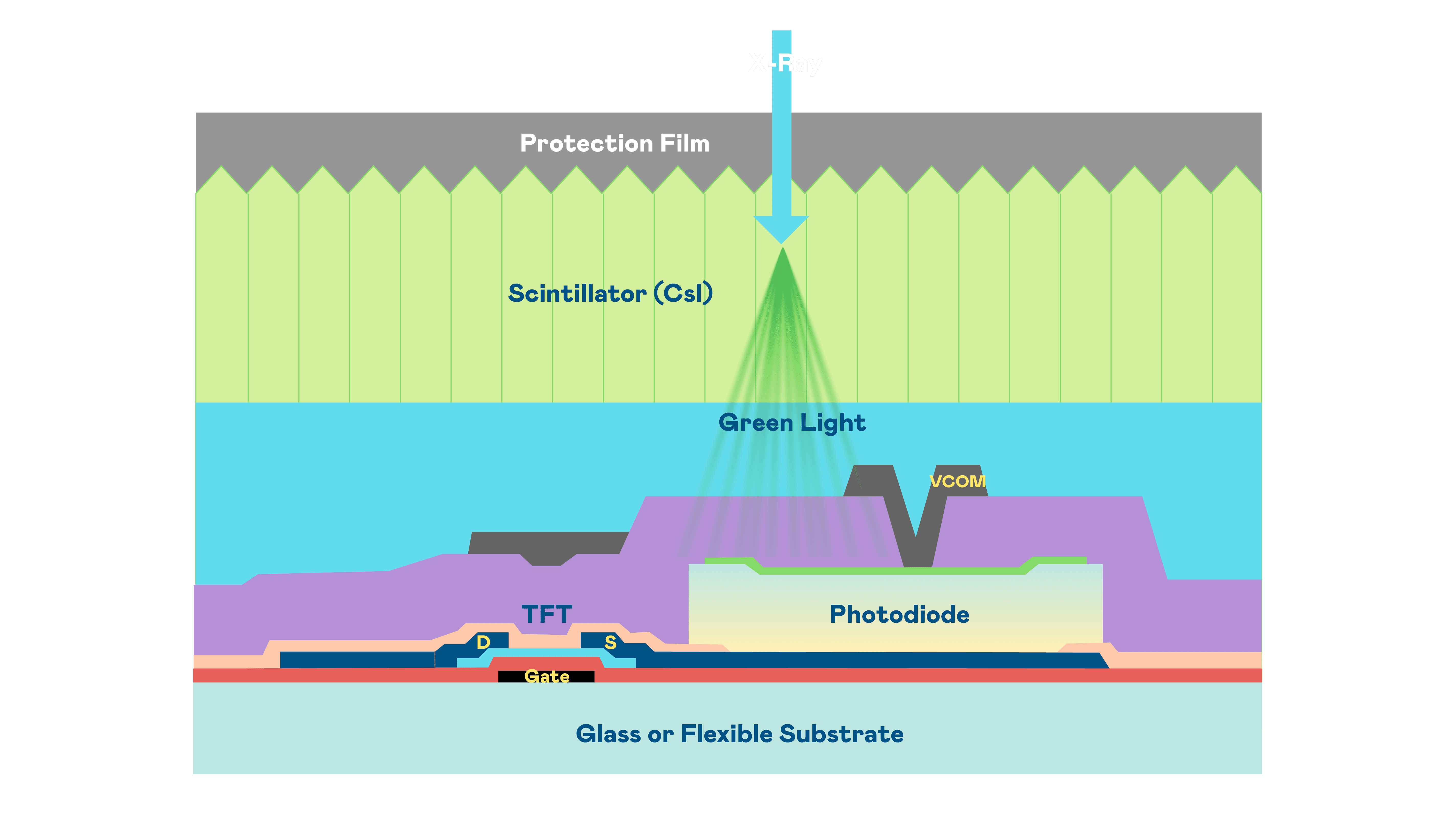 至成国际的X光影像感测阵列使用薄膜电晶体 (TFT) 作为每个像素的读取开关,,,,搭配光电二极体(Photodiode)的光电转换元件,,,,用以感测X光影像讯号。。。。